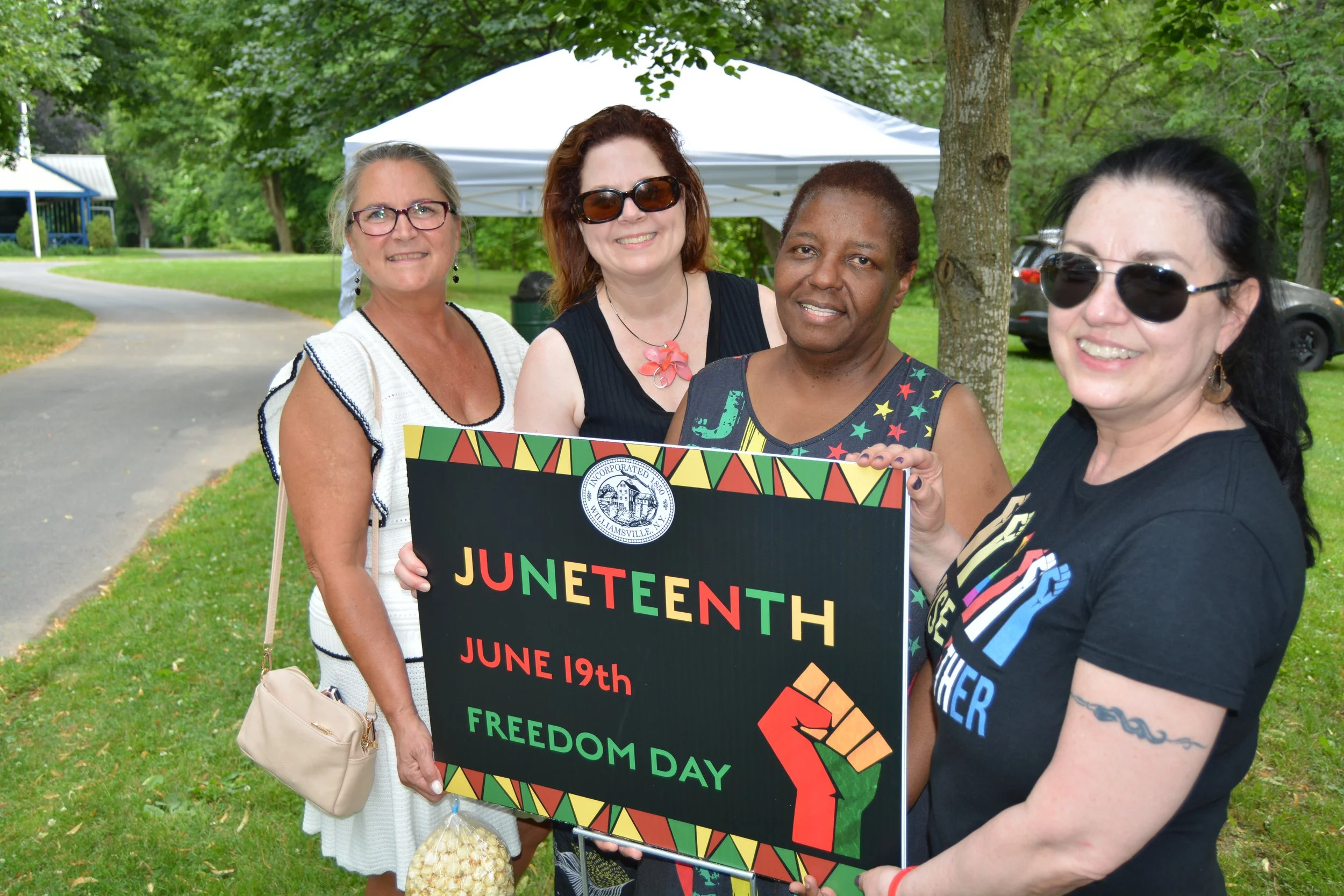 The Village of Williamsville held its first Juneteenth celebra tion on June 21st at Island Park. The Williamsville Cultural and Diversity committee hosted the celebration. The retired Honor able Judge James McLeod was the guest speaker. Other special guests were The Colored Musi cians Club, Vibrant Strings, The Niagara Falls Full Health Center, and The Niagara Falls Underground Railroad Center. The first photo shows, from left to right, Mayor Christine Hunt, Ms Sterns, Atty Danessa Scott Warren, and Donna Delano Kerr. The second photo shows Linda Griffin and the bottom photo shows the Dubois and Roberson families.